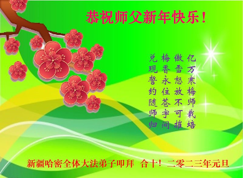 | 【明慧网二零二二年十二月三十一日】在灾难四起的动荡年代,我们迎来了充满希望的2023年。中国大陆各省市大法弟子们怀着无比思念和感恩的心,遥拜师尊新年快乐!在新的一年里,大法弟子们会更加成熟,让更多的世人明真相得救度,让苦难的心沐浴法光。愿大法的光辉洪贯全苍宇,愿师尊展欢颜! 您就是光 照耀万物 您就是水 滋润着一切生命 您是我们的师父 怀抱着无量无尽的生灵 您来到人世间牵起我们的手 我们将不负师恩 兑现来时的愿! 以下为来自中国大陆22省、4个直辖市、4个自治区大法弟子的部份贺词。 新疆哈密全体大法弟子恭祝慈悲伟大的师尊元旦快乐!