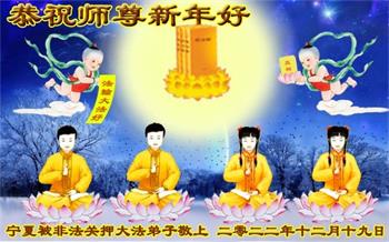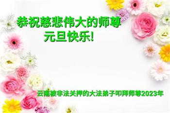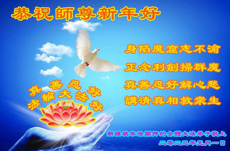 【明慧网二零二二年十二月三十一日】云南被非法关押的大法弟子恭祝慈悲伟大的师尊元旦快乐!天津市被非法关押的大法弟子恭祝慈悲伟大的师尊新年快乐!新疆维吾尔自治区被非法关押的全体大法弟子恭祝伟大的师尊新年好!宁夏回族自治区银川市永宁县全体及被非法关押的大法弟子恭祝师尊新年好!弟子们想念师尊,感谢师尊慈悲救度之恩!弟子们一定会不断精進,学好法,发正念,救度众生,做好三件事,信师信法,圆满随师还。 永宁县全体大法弟子敬上 二零二二年十二月二十日 吉林省长春一全家大法弟子恭祝慈悲伟大的师尊新年快乐!同时也代表被非法关押的大法弟子问师尊新年好!宁夏回族自治区被非法关押的大法弟子恭祝师尊新年好!感恩师尊教我修心向善, 感恩大法造我金刚身段, 感恩大法叫我多救众生, 得救众生新宇庆生聚欢。 感恩师尊加持解难过关, 放下生死弟子意志更坚, 残酷迫害中我背《转法轮》, 信师信法精進实修圆满。 宁夏被非法关押的大法弟子敬上 二零二二年十二月十九日 黑龙江省黑河市被非法关押的大法弟子恭祝师父元旦快乐!甘肃省被非法关押的所有大法弟子恭祝师尊新年快乐!甘肃省被非法关押的所有大法弟子叩拜 二零二二年十二月二十五日 被非法关押在天津市各监狱、看守所的大法弟子恭祝师尊新年快乐!被非法关押的云南省大法弟子恭祝师尊新年快乐!被非法关押在吉林省四平市公主岭市监狱的全体大法弟子恭祝师尊新年好!请师尊放心,不管环境多么险恶,弟子们都会坚修到底,圆满随师还! 被非法关押在吉林省公主岭监狱的全体大法弟子跪拜敬上 二零二二年十二月二十九日 贵州省被非法关押的大法弟子恭祝师父新年快乐!辽宁省大法弟子恭祝慈悲伟大的师尊新年好!辽宁省沈阳大法弟子恭祝慈悲伟大的师尊新年好! 被非法关押在辽宁省沈阳市监狱城的大法弟子恭祝慈悲伟大的师尊新年好! 新疆被非法关押的大法弟子恭祝师尊新年快乐!长春大法弟子代表所有被非法关押在吉林省各黑窝监狱的大法弟子恭祝师尊元旦快乐!被非法关押在黑龙江省女子监狱一大法弟子恭祝师父新年快乐!二零二零年起,我被邪*党-非法判刑九年。监狱虽苦,但我坚修大法的心永远不会变,我决心信师信法,跟师父走到底。就走师父安排的路。 感谢师父的慈悲救度,叩谢师父! 在江苏省苏州监狱被非法关押的全体大法弟子恭祝慈悲伟大的师尊元旦快乐!师尊好!师尊辛苦了! 面对疫情的快速扩散,众生的惶恐、不知所措,大法弟子更知道时间的紧迫,救度众生的责任重大。留给众生的得救时间也许会稍纵即逝,大法弟子必须修好自己,弥补损失,承担起助师正法、证实法、救度众生的神圣使命。 我们一定学好法、发好正念、做好三件事。我们就是为法而来的生命,维护法、证实法、救度众生是大法弟子生命的全部意义。一定精進实修,完成使命,无愧为创世主亲度的正法时期的大法弟子。 弟子叩谢师恩! 被苏州监狱非法关押的大法弟子叩拜 四川乐山市嘉州监狱被非法关押的全体大法弟子恭祝慈悲伟大的师尊新年快乐!贵州省贵阳市大法弟子代被非法关押在监狱的大法弟子恭祝慈悲伟大的师父新年快乐!贵州省贵阳市大法弟子代被非法关押在看守所的大法弟子恭祝慈悲伟大的师父新年快乐!重庆市被非法关押的全体大法弟子恭祝慈悲伟大的师父新年快乐!山东省济南市男子监狱被非法关押的大法弟子恭祝大法师父新年快乐!不论狱中迫害多么残酷,弟子们依然坚信师父坚信大法,始终保持正念,正念清除邪恶,请师尊放心。 曾被非法关押迫害的大法弟子恭祝慈悲伟大的师尊新年好!曾被山东监狱系统、劳教系统非法关押迫害和仍被关押迫害的大法弟子恭祝师尊新年快乐! |