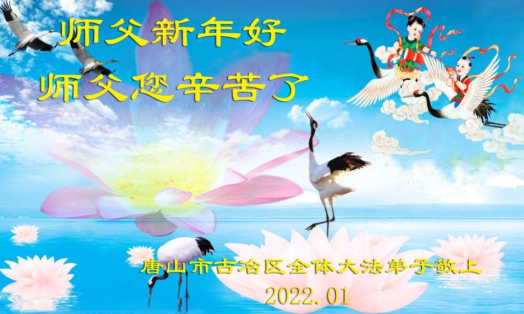 师父好 珍惜师父赐法宝 精進实修向内找 惟愿师父欣慰笑 众生得救心愿了 河北唐山市古冶区全体大法弟子恭祝师父新年好!
