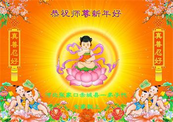 尊敬的师父:新年好!弟子和全家四代修炼人以及不修炼的家人恭祝慈悲伟大的师尊新年快乐!师父的慈悲润物无声的伴随着弟子的修炼道路,感恩师尊的慈悲苦度,师父辛苦了! 弟子在中国大陆遥拜师尊!师父新年好! 河北省张家口市赤城县一学法小组大法弟子恭祝师尊过年好!