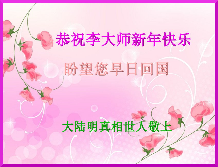 尊敬的师父:您好!我是一个大学生。当我遇到困境的时候,我都会诚念“法轮大法好,真善忍好”,特别是最近这段时间,很多看似不可能的事情奇迹般的办成了。我真切的感受到大法的神奇和您的护佑!在此我衷心的向您表达感谢! 师父,过年好! 师父,谢谢您! 大陆明真相世人恭祝李大师新年快乐!盼望李大师早日回国!