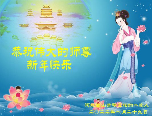 在当今世道道德沦丧、乱象丛生、灾情遍地、人类岌岌可危之时,是慈悲伟大的师尊为宇宙众生免于淘汰开创了这万古不遇的机缘。师尊为挽救众生,力挽狂澜,为众生承担巨难业债。师尊啊!您的慈悲光耀寰宇;您的洪恩普及众生;您的巨大付出苍穹更新,弟子们深深的感恩!得法前我们陷在红尘乱世中,迷失了本性,执着繁重,造了无数的罪业。今生幸遇师尊高德大法才有了我们的今天,是师尊洪大的慈悲宽容,将我们从地狱捞起,费尽心血将我们的生命洗净重塑。师尊悉心看护、谆谆教诲。 弟子和家人对师尊的感恩无以言表,在新年到来之际,向慈悲伟大的师尊道一声:师尊您辛苦了! 弟子携家人叩拜! 山东烟台大法弟子与明白真相的家人恭祝慈悲伟大的师尊过年快乐!