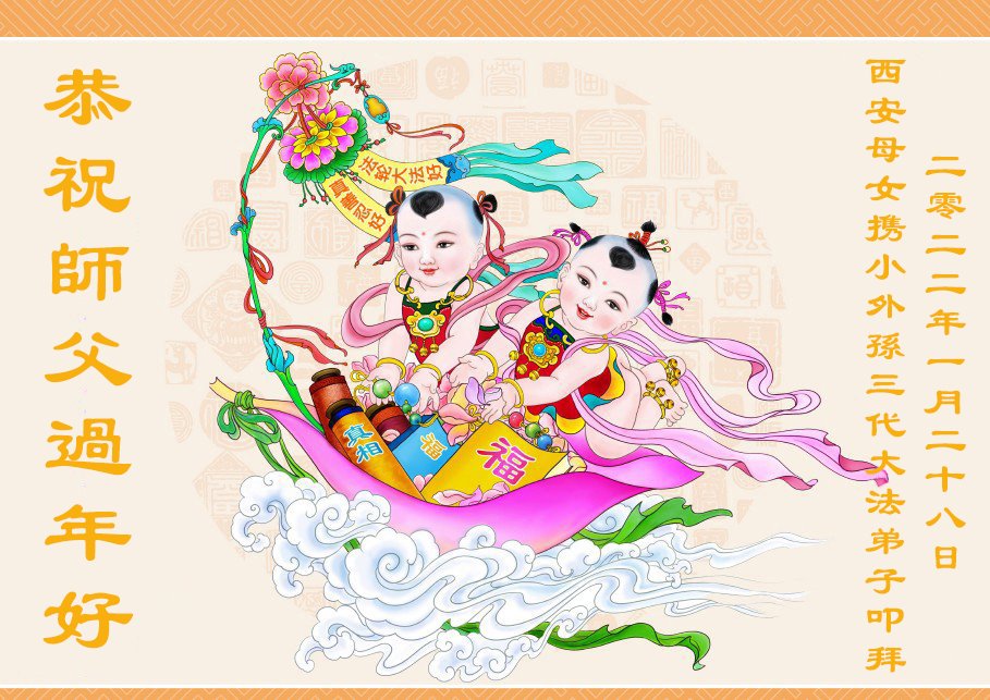 恭祝师父过年好! 感谢师父的救度之恩!弟子一定精進,做好“三件事”,兑现誓约随师还! 衷心恭祝师父过年好! 陕西省西安市母女携小外孙三代大法弟子叩谢师恩! 2022年1月28日 陕西西安北郊母女大法弟子恭祝慈悲伟大的师尊新年快乐!