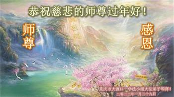 重庆市全体法轮大法弟子给师父拜年,恭祝慈悲伟大的师父新年快乐!感谢师父对弟子的慈悲苦度! 重庆一家庭学法小组大法弟子恭祝师尊过年好!