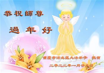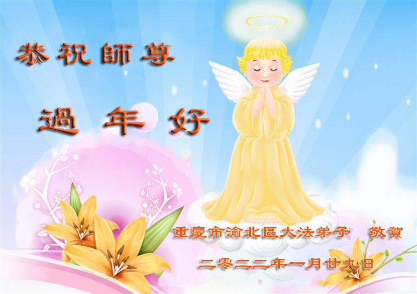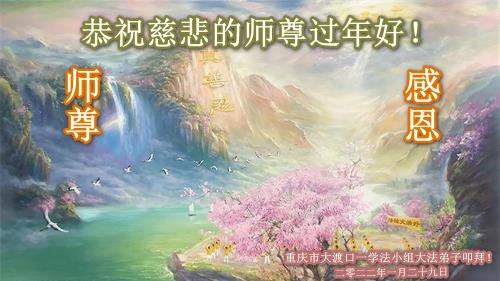 师父您好! 在这二零二二年喜庆的日子里,我们重庆同路学法小组全体大法弟子向慈悲伟大的师父问好,师父过年好! 在这不平凡的日子里,弟子们在努力学法,努力去掉各种执着,找自己的不足。同时也在加紧去救人,努力修炼,兑现自己的誓约,紧跟师父回家园! 重庆同路学法小组全体大法弟子向师父叩拜! 重庆同路学法小组全体大法弟子敬贺 2022年1月24日 重庆市江北区一青年大法弟子恭祝师尊中国新年快乐!