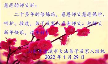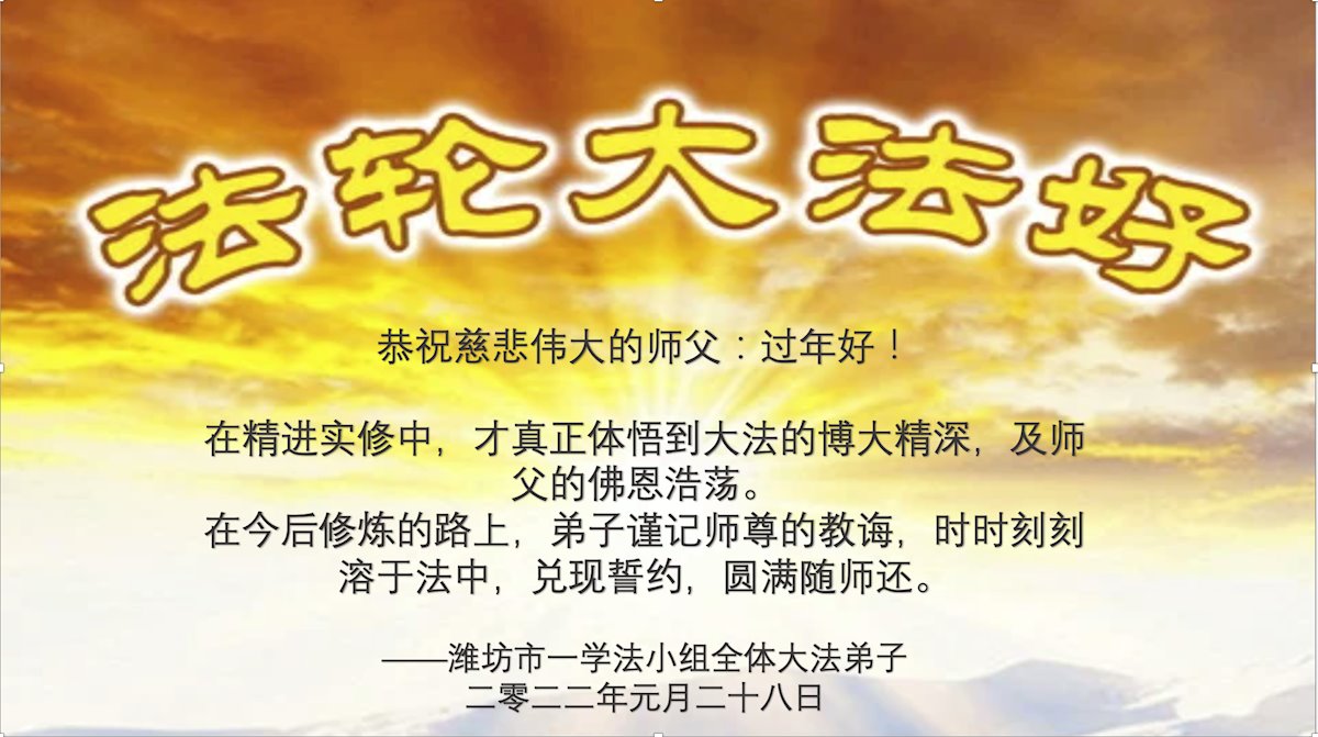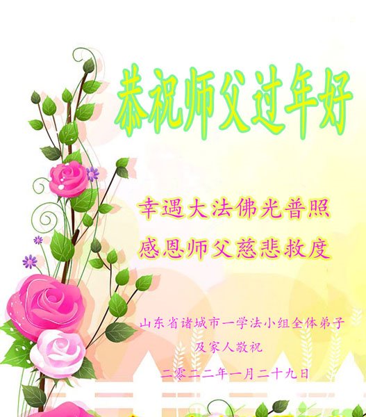 【明慧网二零二二年二月一日】 山东省潍坊市诸城市一学法小组全体大法弟子及家人恭祝师父过年好!