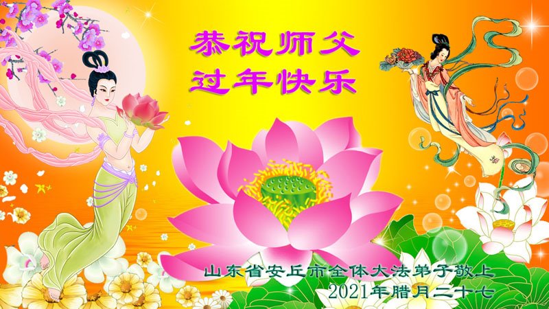 感谢师尊的一路保护!感谢您的慈悲保护和付出!弟子们用尽世间的语言也无法表达对师尊的感恩之心。弟子们唯有精進实修,修心断欲,去掉各种执着心,做好三件事,多救众生,以报师恩。 山东省潍坊市安丘市全体大法弟子恭祝师父过年好!