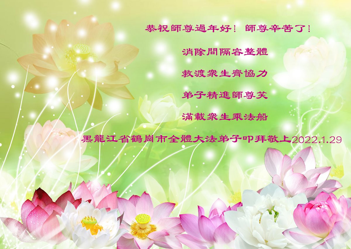 消除间隔容整体 救度众生齐协力 弟子精進师尊笑 满载众生乘法船黑龙江省鹤岗市全体大法弟子叩拜敬上 2022年1月29日 黑龙江省大法弟子夫妻恭祝师尊过年好!师尊辛苦了!