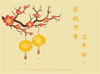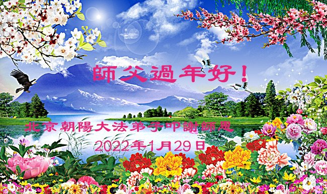 师父辛苦了!法轮大法好,真善忍好! 北京昌平城区一大法弟子 2022年1月28日 北京大法弟子敬祝慈悲伟大的师父过年好!