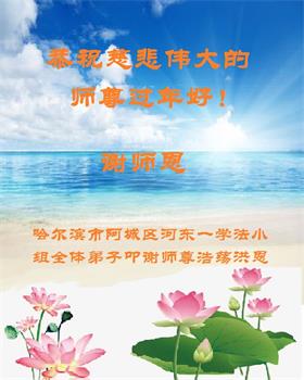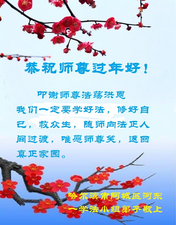 恭祝慈悲伟大的师尊过年好!叩谢师尊浩荡洪恩! 我们一定多学法,学好法,做好三件事,返回真正的家园。 哈尔滨市阿城区河东全体大法弟子敬上 黑龙江省哈尔滨市阿城区河东一学法小组大法弟子恭祝慈悲伟大的师尊过年好!