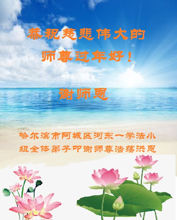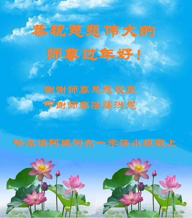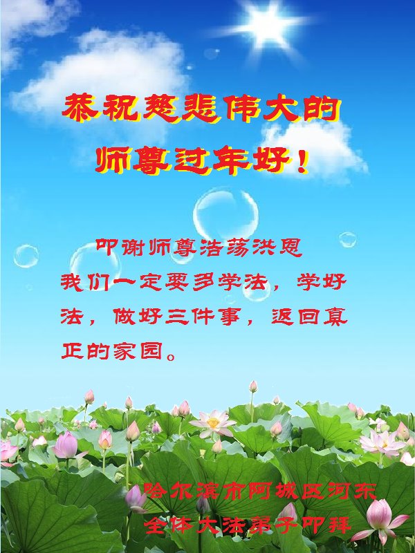 恭祝师尊过年好!多谢师父对弟子保护,慈悲救度! 哈尔滨市阿城区一大法弟子敬上 黑龙江省哈尔滨市四人学法小组大法弟子恭祝师尊新年快乐!