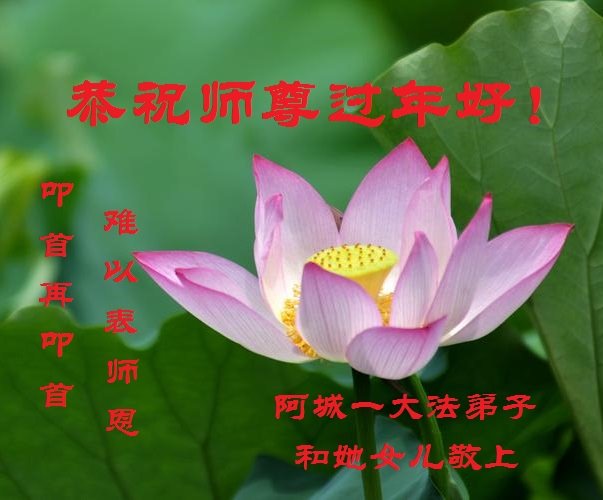 我们盼望师父早日回到大陆团聚,普天同庆。 哈尔滨市阿城一大法弟子敬上 黑龙江省哈尔滨市阿城市区河东一大法弟子和她女儿恭祝师尊过年好!