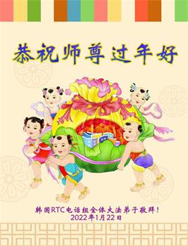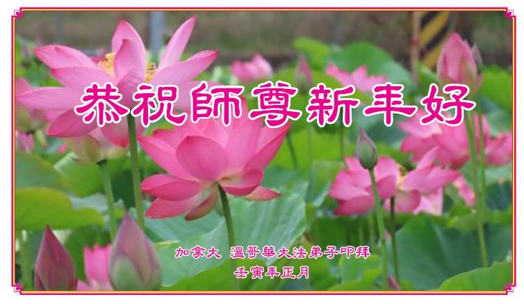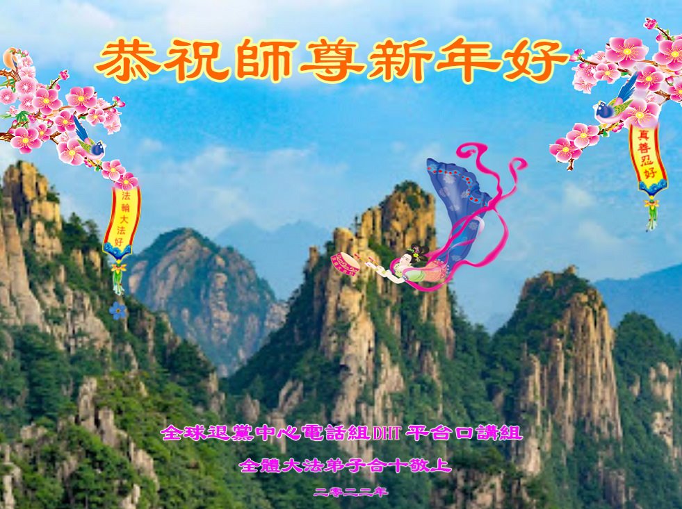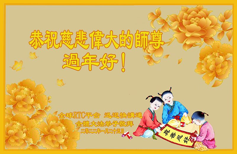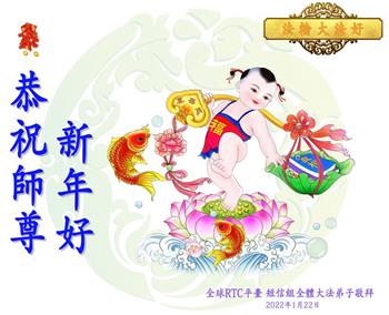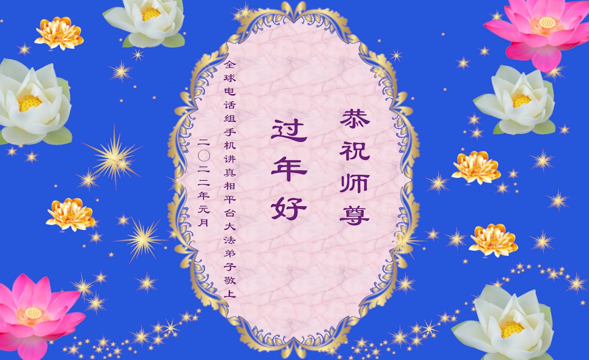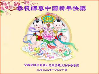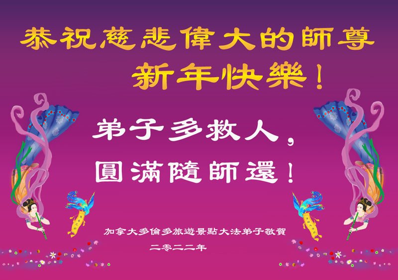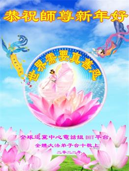 | 【明慧网二零二二年二月一日】在中共迫害法轮大法的二十三年中,世界各地的大法弟子肩负着向本国和中国大陆被谎言欺骗的众生讲真相的使命,他们共同建立媒体,以游行、景点讲真相、集体炼功洪法等各种方式将法轮大法好的真相传遍世界。 在中国新年到来之际,海外各国大法弟子们恭祝师尊新年好!大法弟子们会坚修大法,多讲真相,救度各阶层世人,援助中国大陆仍在遭受中共迫害的大法弟子。 师尊慈悲转法轮 苍宇换新众神惊 真相福音遍世界 得救众生谢师尊 线上九天班暨教功班全体大法弟子恭祝师尊中国新年好!海外全球.退:党!中心电话组DHT平台全体大法弟子恭祝师尊新年好!恭祝慈悲伟大的师尊新年好!感恩师尊慈悲苦度!师尊您辛苦了!弟子们会珍惜万古机缘,学好法,修好自己,抓紧去人心。放下自我、同心协力相互配合好多救人!惟愿师尊笑!法轮大法好,真善忍好! 全球.退:党!中心电话组DHT平台全体大法弟子合十敬上! 墨尔本弗兰克斯顿(Frankston)炼功点大法弟子恭祝师父中国新年快乐!位于澳大利亚墨尔本的海滨度假胜地,弗兰克斯顿(Frankston)法轮大法炼功点是一个能代表澳洲特色的多元文化社区,学员来自澳洲本地以及英国、爱尔兰、马来西亚、土耳其、波兰和罗马尼亚的移民,每周一起集体炼功。尽管墨尔本在过去两年曾一直处于封锁状态,但学员们仍然能够在遵守政府相关规定的前提下坚持在弗兰克斯顿炼功点炼功,并向过往的民众介绍大法的美好和反迫害的真相。中国新年来临,弗兰克斯顿炼功点的全体大法弟子,恭祝慈悲伟大的师父新年快乐!感恩师尊的慈悲救度。弟子们将更加精進,不负师恩。 全球电话组手机讲真相平台(CTT)大法弟子恭贺师尊过年好!加拿大温哥华天国乐团全体大法弟子恭祝师尊过年好!全球营救平台全体大法弟子恭祝师尊过年好!日本横滨炼功点大法弟子恭祝师尊过年好!师恩浩荡,弟子无以回报,愿以实修、多救人完成使命为献礼。 新西兰奥克兰公园炼功点大法弟子恭祝师父过年好!在这新的一年里,我们要更加珍惜救人的机会,做好师父安排的三件事,在矛盾面前向内找,做真修实修的大法弟子,让炼功点真正成为洪扬大法、救度众生的好环境。 希望.之声全体大法弟子恭贺师尊壬寅年新年快乐!加拿大温哥华在中领馆前反迫害的大法弟子给师尊拜年!恭祝师尊新年快乐!感恩师尊慈悲救度众生,恭祝师尊新年快乐! 加拿大温哥华学员感恩师尊慈悲救度众生,恭祝师尊新年快乐! 加拿大大瀑布景点大法弟子恭祝师尊新年快乐!德国电话讲真相小组全体大法弟子恭贺师父过年好!新西兰腰鼓队大法弟子恭贺师尊过年好!腰鼓是救度众生的法器,我们在做好师父安排的三件事的同时,请师父放心,我们要把鼓打好,打出内涵,救度更多的有缘人。 美国彩虹印刷装订厂全体大法弟子恭祝师父过年好!法国电话组大法弟子恭祝师尊过年好!法国电话组大法弟子恭祝师尊过年好!新的一年,我们要救更多的海内外华人,不辜负师尊的慈悲救度! 全球电话组DHT平台全体大法弟子恭祝慈悲伟大的师尊新年快乐!全球电话组DHT平台一学法小组大法弟子恭祝慈悲伟大的师尊新年快乐!全球营救平台筹备组全体大法弟子恭祝慈悲伟大的师尊新年好!弟子们一定听师尊的话,多学法,多救人,去执着。 全球营救平台910主流社会专案组全体弟子恭祝师尊过年好!弟子们感恩师尊洪传大法、慈悲救度!弟子们会坚修大法,同化大法,听师父的话,做好三件事,援助大陆大法弟子主体,救度主流社会的众生,走正随师正法回家的路,圆满功成。910全体弟子叩谢师恩! 全球营救平台发正念组全体大法弟子恭祝师尊新年快乐!全球营救平台发正念组全体大法弟子恭贺 马来西亚阿罗街真相点全体大法弟子恭祝慈悲伟大的师尊新年快乐!师尊一念 法力无边正天纲 弟子践约 红尘深处化做救人场 有缘众生 喜闻法轮大法真相 除尽邪恶 祥瑞万千乾坤朗 加拿大多伦多旅游景点大法弟子恭祝师尊新年快乐!全球营救平台美西组大法弟子恭祝师尊新年快乐!全球营救平台911学法房间全体大法弟子恭祝师尊过年好!全球营救平台903新手拨打培训组大法弟子恭祝师尊新年快乐!感恩师尊!亚利桑那州格兰戴尔炼功点大法弟子恭祝师尊过年好!澳洲手机自动电话项目全体大法弟子恭祝师尊过年好!海外全球.退:党!中心电话组DHT平台701口讲组全体大法弟子恭祝师尊新年好!全球营救平台美西组拉斯维加斯大法弟子恭祝师尊新年快乐!全球营救平台全体大法弟子恭祝慈悲伟大的师尊过年好!全球营救平台全体大法弟子叩拜师尊!恭贺师尊过年好!法轮大法好,真善忍好! 全球营救平台真相稿件组全体全体大法弟子恭祝师父过年好!感谢师父的慈悲加持与看护,弟子们又走过了充满收获的一年。 壬寅年到来之际,弟子们恭祝慈悲伟大的师父过年好!谢谢慈悲伟大的师父! 纽约腰鼓队大法弟子恭祝慈悲伟大的师尊过年好!韩国腰鼓队大法弟子恭祝慈悲伟大的师尊过年好!加拿大多伦多旅游景点讲真相全体大法弟子恭祝师尊新年快乐!多伦多旅游景点讲真相学法组、尼亚加拉大瀑布真相点、唐人街退!党!平台、退!党!热线、电视塔真相点、皇后公园真相点、湖边码头真相点全体大法弟子恭祝师尊新年快乐! 希望.之声媒体集团恭祝师尊新年好!师尊辛苦了!韩国RTC电话组全体大法弟子恭祝慈悲伟大的师尊