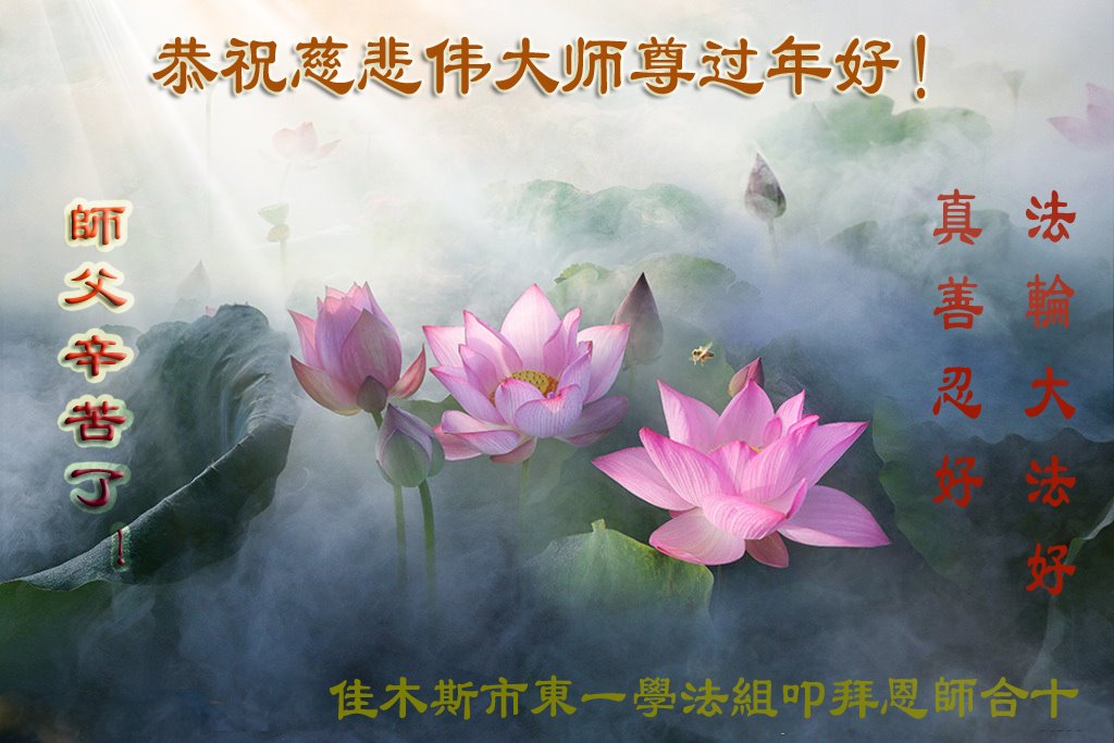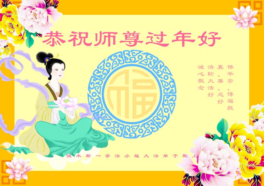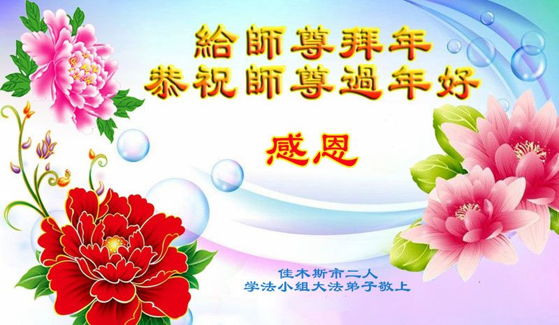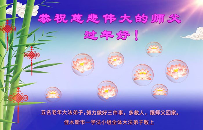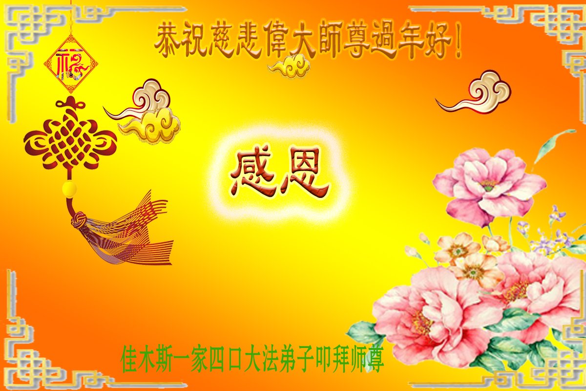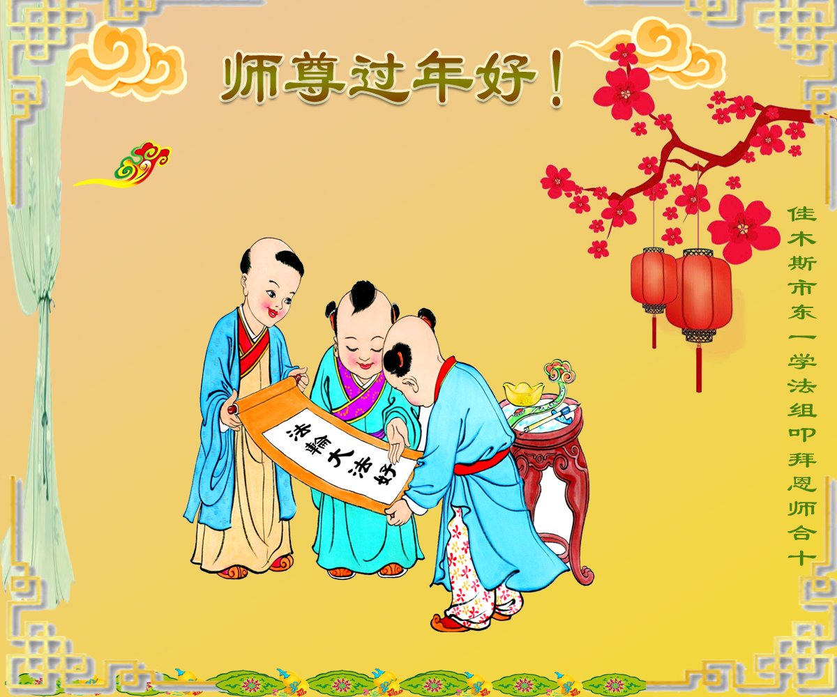 恭祝师尊过年好!弟子每一次心性的提高与改变,都离不开师尊慈悲保护,对师尊的感恩之心无以言表,只能汇成一句“师尊过年好”。 佳木斯市一家三位大法弟子敬上 黑龙江省佳木斯一家四口大法弟子恭祝慈悲伟大师尊过年好!