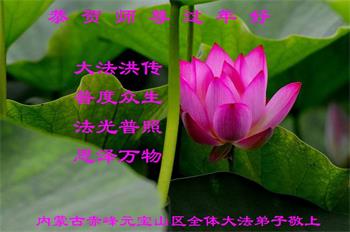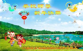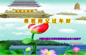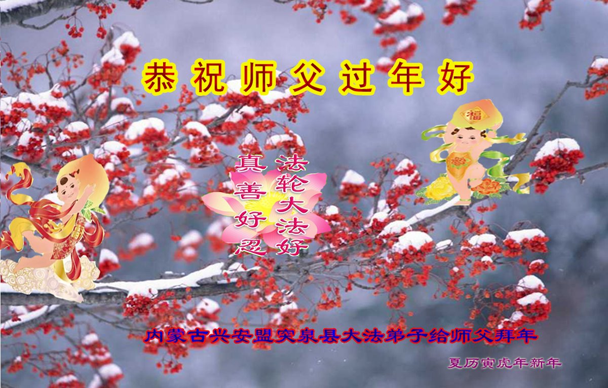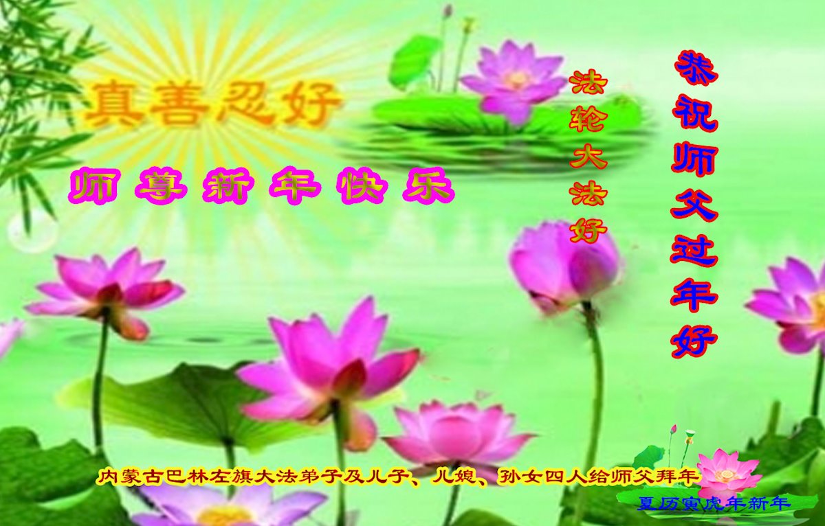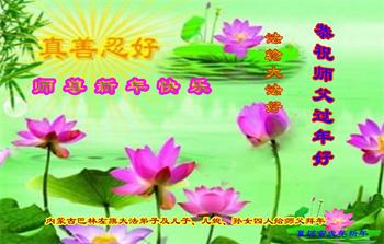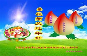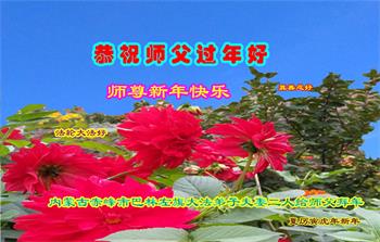 内蒙古通辽市霍林郭勒地区全体大法弟子给师父拜年:恭祝师父过年好!新年快乐! 内蒙古赤峰市巴林左旗大法弟子及儿子、儿媳、孙女四人给师父拜年!