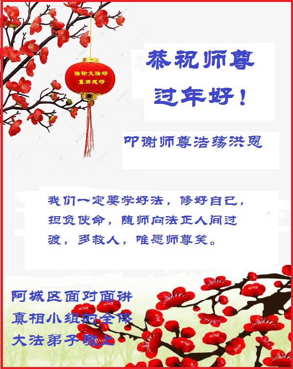 恭祝师尊过年好!叩谢师尊浩荡洪恩! 我们面对面讲真相小组的全体大法弟子一定要学好法,修好自己,担负使命,随师向法正人间过渡,多救人,唯愿师尊笑。 哈尔滨市阿城区面对面讲真相小组的全体大法弟子敬上 黑龙江哈尔滨市一九旬老大法弟子恭祝伟大师尊过年好!
