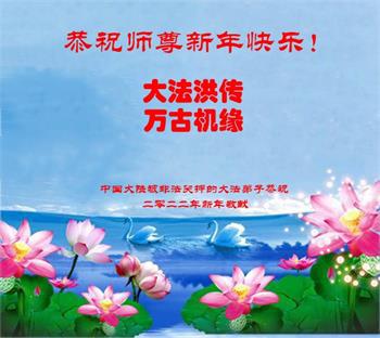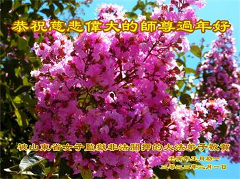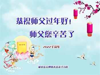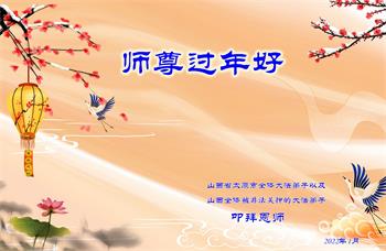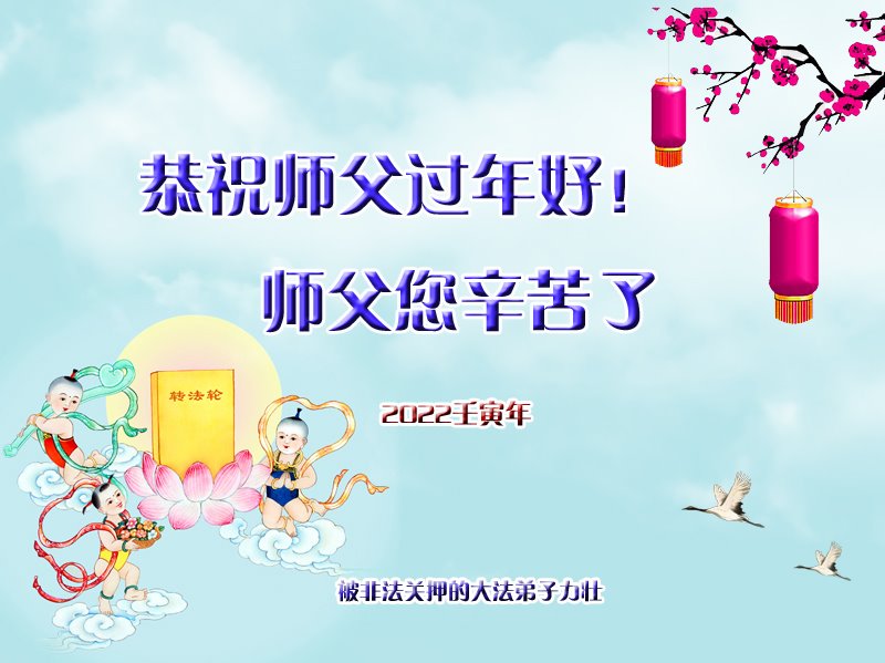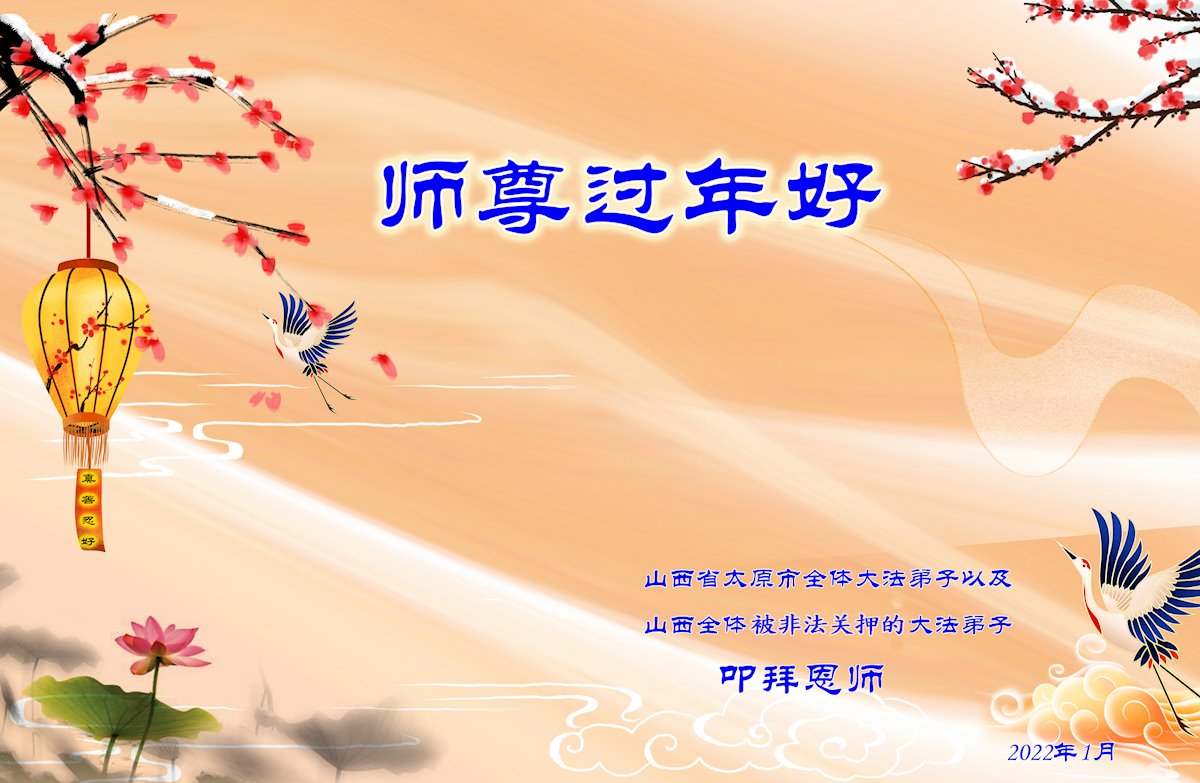 山西省太原市全体大法弟子和山西省被非法关押看守所、狱中的全体大法弟子共同给师尊拜年!恭祝恩师过年好! 弟子们一定坚定正念,除灭恶尽,决不落下跟随师尊回家的步伐,圆满完成自己史前与师尊签定的誓约!了愿回家! 被山东省女子监狱非法关押的大法弟子恭祝慈悲伟大的师尊过年好!