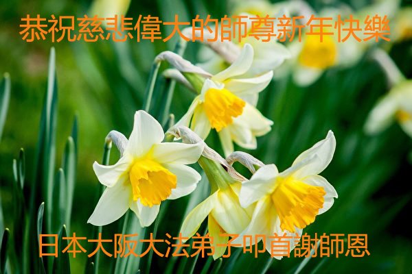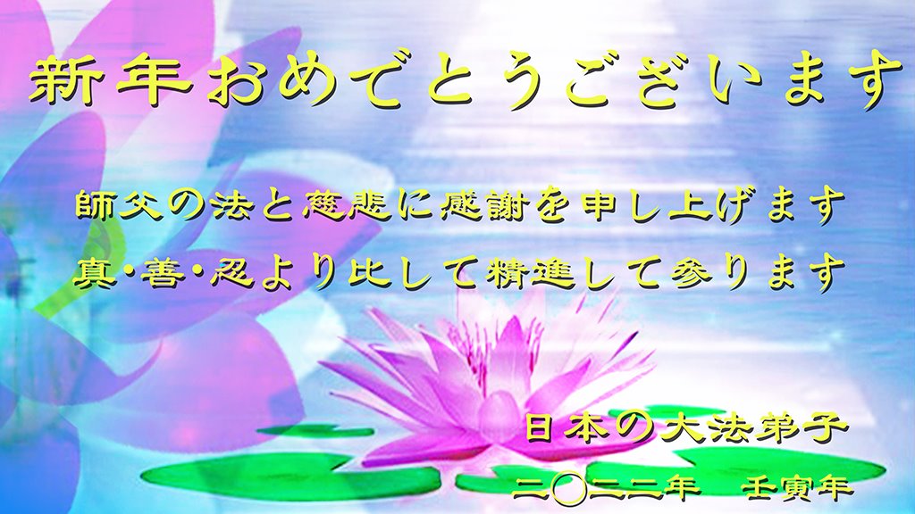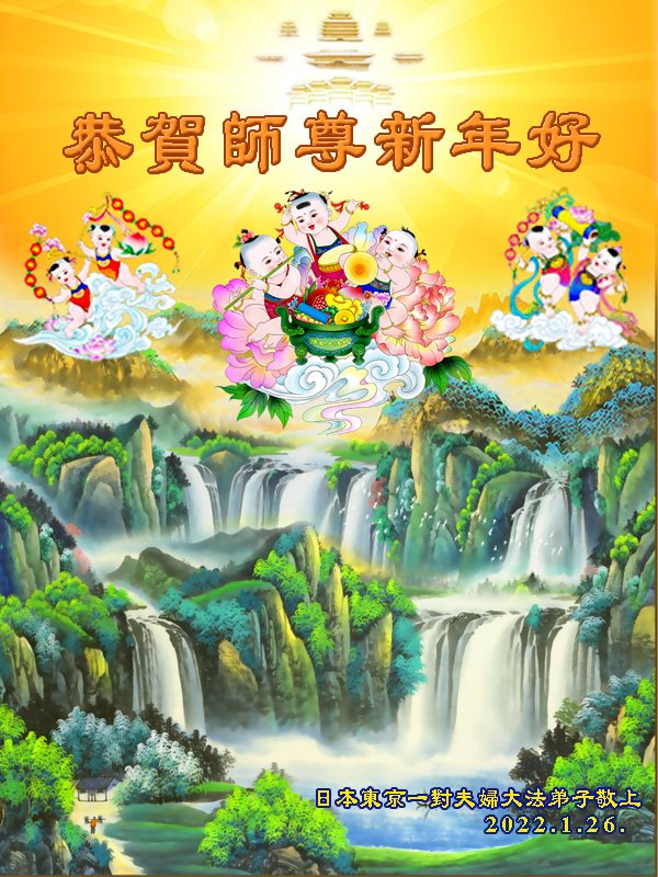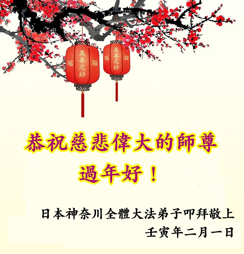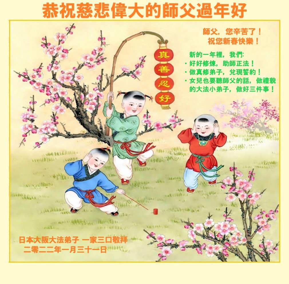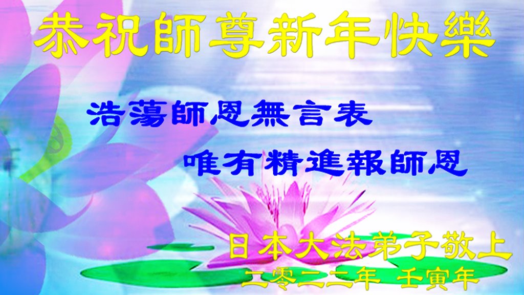 师尊,您辛苦了!在新的一年里,好好修炼,助师正法!修去根本执着,同化大法,做真修弟子,兑现誓约!在最后的时刻,证实大法,以谢师恩。带好小弟子,不辜负师尊! 谢谢师尊! 日本中部地区法轮大法弟子恭祝师尊新年快乐!