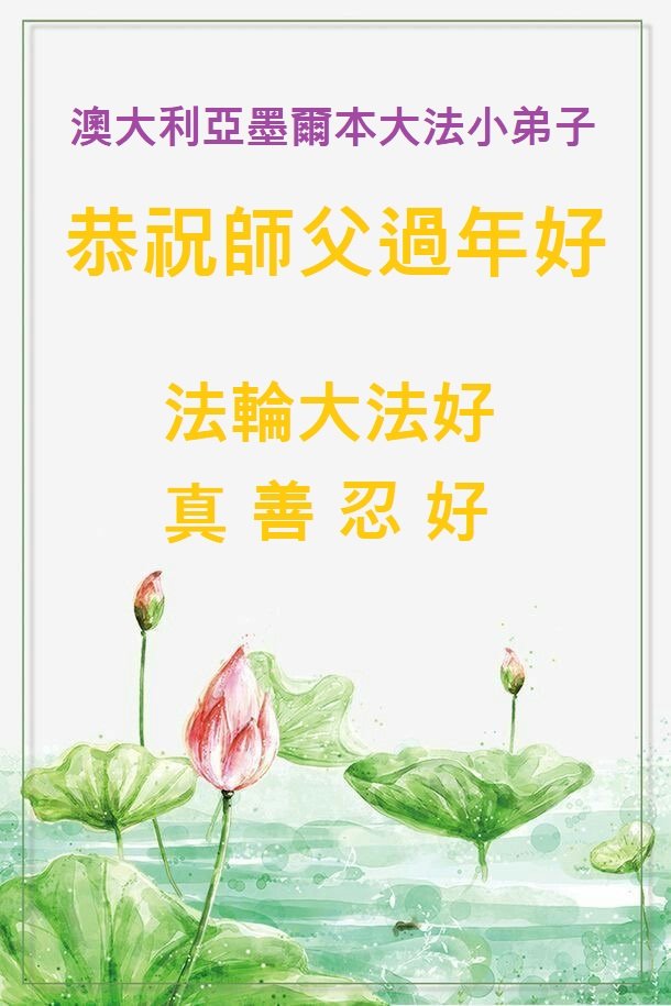 世间的语言难以表述弟子对师父的感恩之心!弟子唯有更好的学法、背法、修心,尽力在电话平台上救度有缘的众生。 澳大利亚墨尔本电话组大法弟子恭祝师尊过年好!