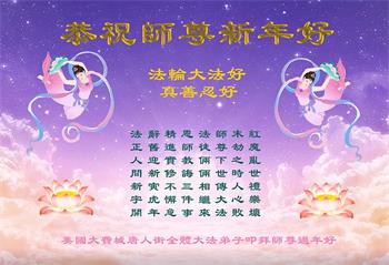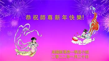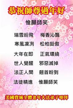 敬祝师父新年好!今生能做师父的弟子,我们无比荣幸,用尽千言万语,也无法感激师父的救度之恩,唯有精進再精進,多救世人。 美国华盛顿DC老年大法弟子恭祝师尊新年快乐!