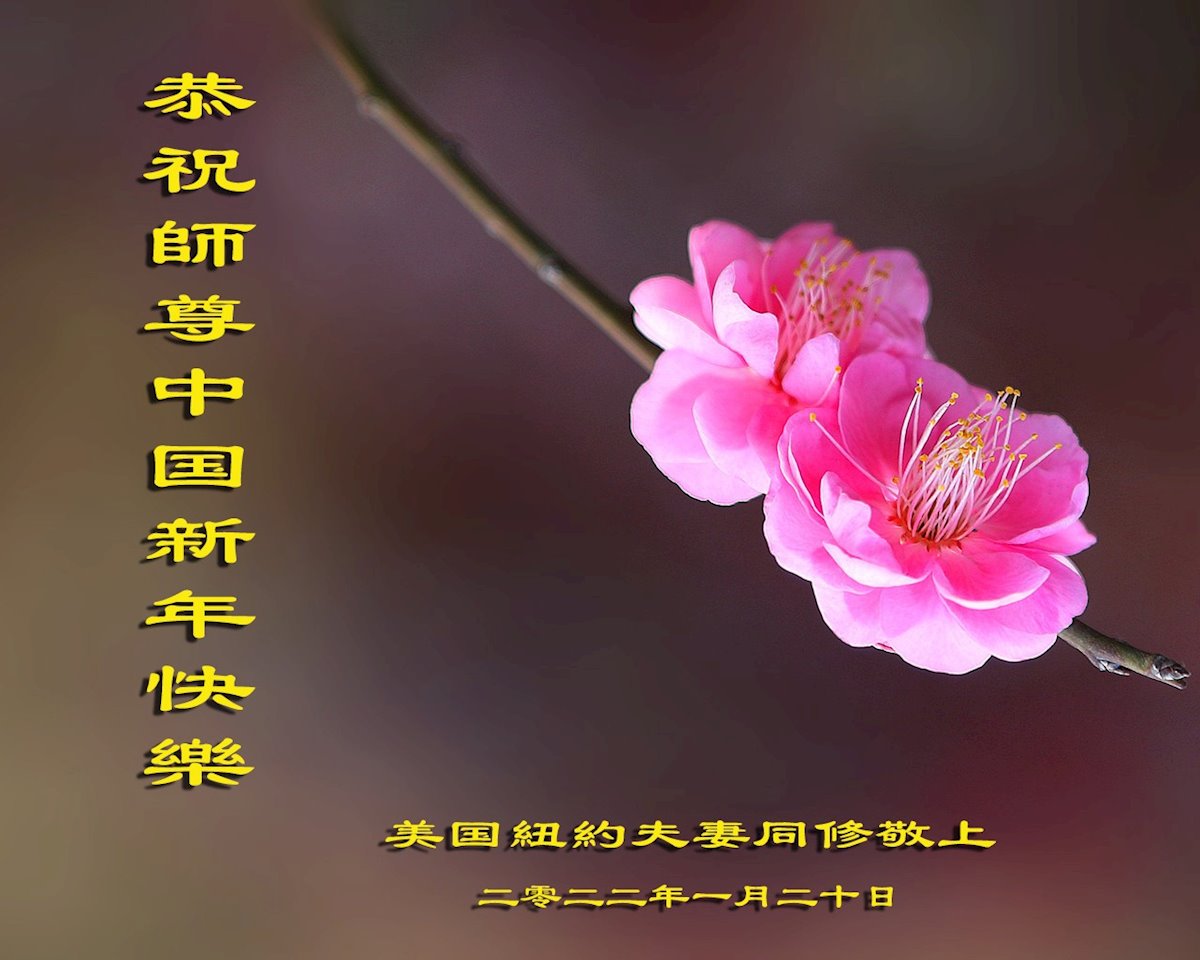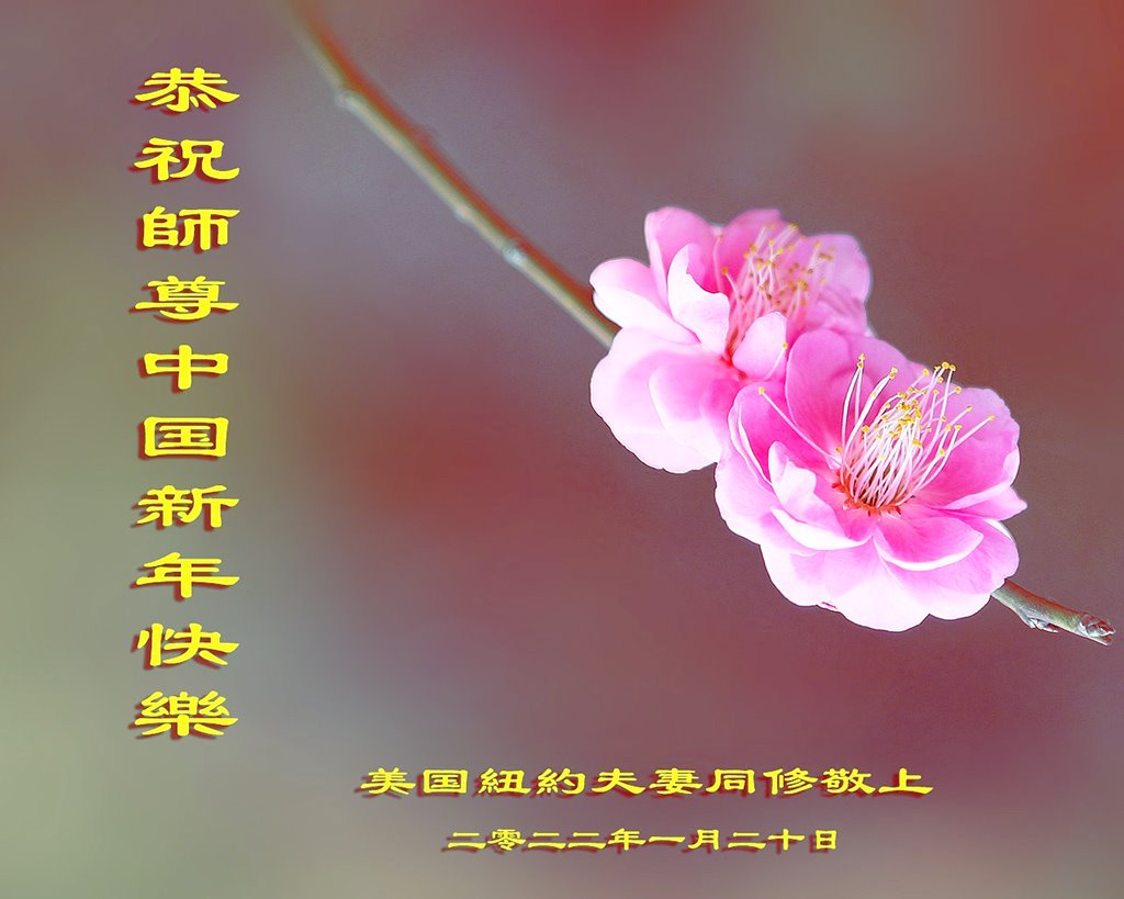 恭祝慈悲伟大的师尊中国新年快乐! 感恩师尊慈悲救度,在新的一年里,弟子一定实修自己,做好三件事,与家人同修共同精進。 纽约夫妻同修敬上 二零二二年一月十六日 美国纽约大法弟子恭祝师尊新年快乐!