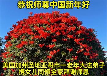 美国加州圣地亚哥市一老年大法弟子携女儿同修全家恭祝师父过年好!