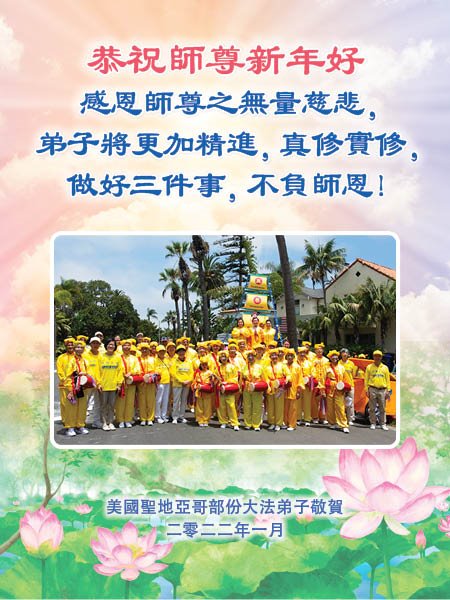 美国圣地亚哥全体大法弟子恭祝慈悲伟大的师尊新年快乐!