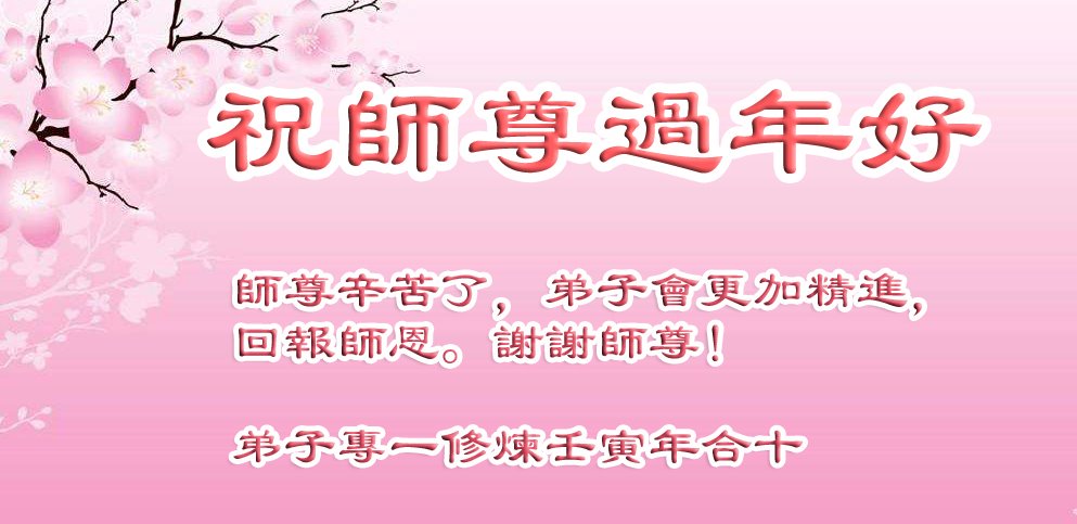 中国传统大年来临之际,弟子给师尊拜年!向伟大慈悲的师尊送上由衷的祝愿!师父过年好! 师父辛苦了!您为了拯救大穹,救度无量众生,耗尽心血。指导弟子精進实修,指引弟子走正,承担正法期间历史赋予我们伟大的责任。弟子要精進学法做好三件事,坚信大法坚信师父,坚定的维护好大法。 回想二十多年修炼路程,心情激动,万分感激师父的慈悲苦度,精心保护。感恩师父!跪拜师父!敬献师父过年好!师父过年好!合十 美国纽约州橙县中城大法弟子全家恭祝师尊新年快乐!
