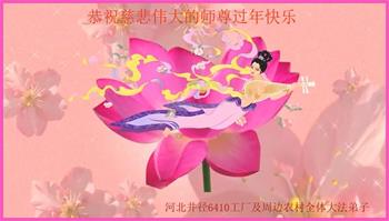 在新的一年里,弟子们一定甩掉污浊的包袱,精進实修,向内找、修好自己、整体提高,完成历史使命,救度众生,不辜负师父的慈悲苦度。弟子们叩拜师尊! 河北井径6410工厂及周边农村全体大法弟子恭祝慈悲伟大的师尊过年快乐!