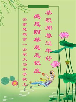 感恩师尊慈悲救度!师尊辛苦了! 云南省楚雄市一全家大法弟子敬上 云南昆明一大法弟子恭祝师尊新年快乐!