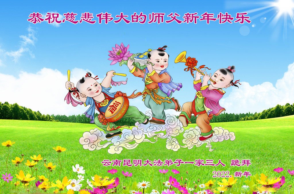 【明慧网二零二二年二月三日】 云南昆明大法弟子一家三人恭祝师尊新年快乐!