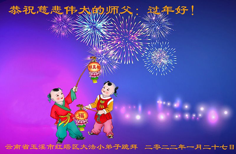 恭祝慈悲伟大的师父过年好!谢谢师父的慈悲救度!师父谢谢您! 云南省玉溪市红塔区大法小弟子跪拜! 辽宁省营口大石桥市南部一家三位大法弟子敬祝师尊过年好!