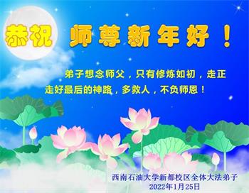 我们怀着感恩之心给慈悲伟大的师尊拜年!恭祝师尊过年好!期盼早日见到师尊! 西南石油大学四川省成都校区全体大法弟子恭祝师父新年愉快!