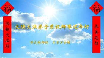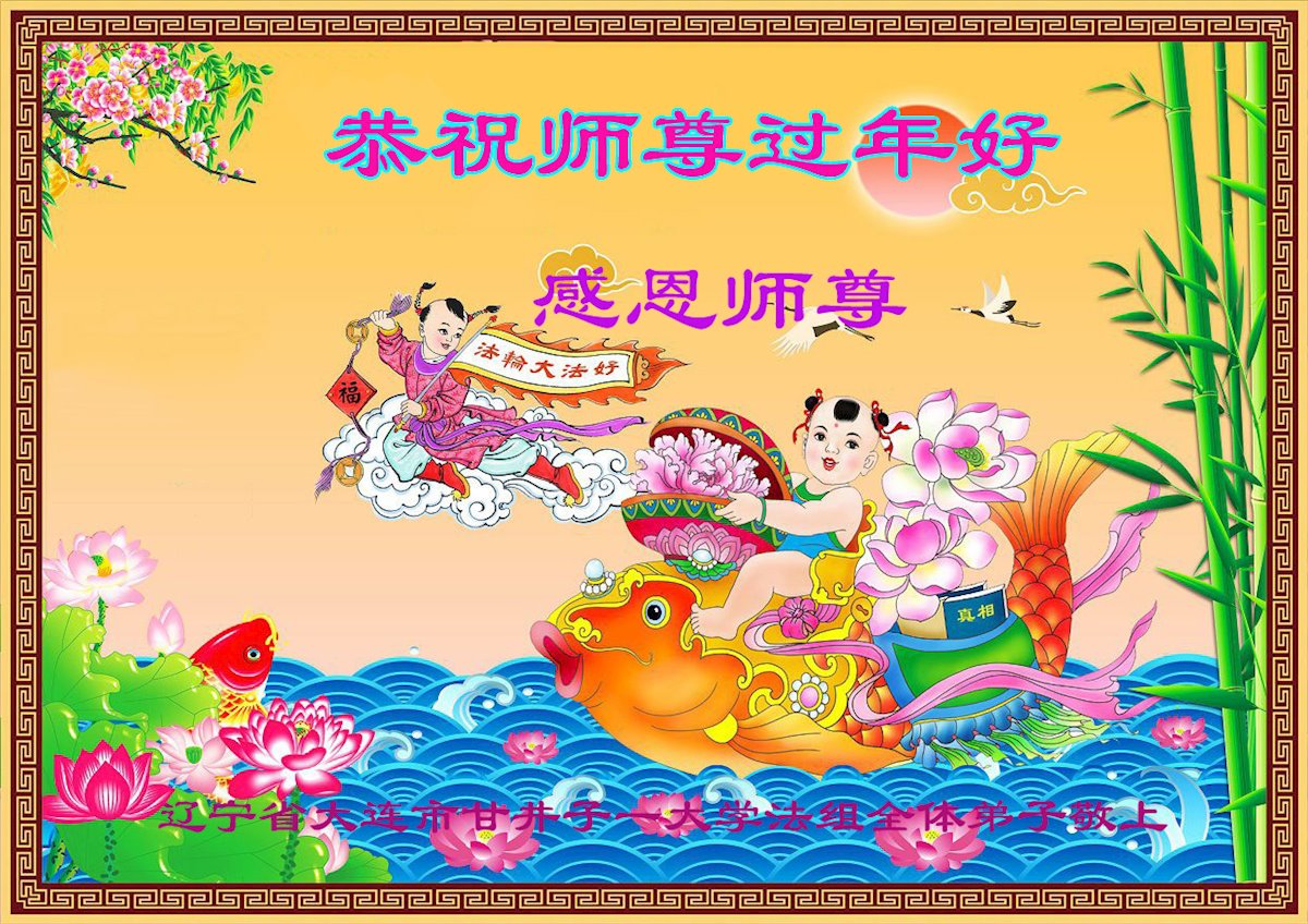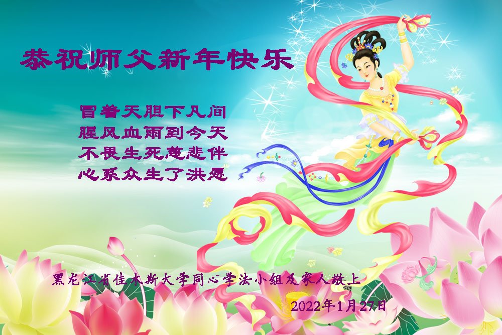 恭祝师父新年快乐! 冒着天胆下凡间 腥风血雨到今天 不畏生死慈悲伴 心系众生了洪愿 叩拜师尊! 黑龙江省佳木斯大学同心学法小组全体大法弟子及家人敬上 辽宁省大连市甘井子一大学法组全体弟子恭祝师尊过年好!