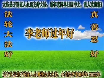 尊敬的师父新年好! 二零二二年即将来临,能進入新的一年是如此的幸运。只有明白真相的人才倍感珍惜,特别是大法弟子。感恩师父的伟大慈悲救度,用尽人间语言也表达不了弟子的感激之心。弟子唯有精進实修。助师正法是大法弟子的使命和责任,珍惜师父为我们延续的时间多救人。学好法是根本,只有学好法向内找才能做好三件事。自己要努力做好,不辱使命,不辜负师父的期望,兑现来世的誓约! 恭祝师父新年快乐!叩拜师父。 烟台市芝罘区大法弟子 二零二二年一月二十四日 吉林延边明真相一家人恭祝李大师过年好!
