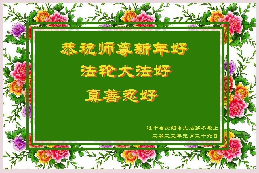 1.辽宁省沈阳市一大法弟子及明真相的家属恭祝师父新年快乐! 辛丑年 2.恭祝师尊新年快乐!弟子要做好三件事跟师父回家。 沈阳老弟子 二零二二年元月敬上 双手合十 3.恭祝师父新年好!新年快乐!师父您辛苦了! 大陆大法弟子 二零二二年一月六日 4.恭祝慈悲伟大的师父新年快乐!弟子会修好自己多救世人。 沈阳大法弟子 二零二二年元月 5.恭祝慈悲伟大的师尊新年快乐!感恩师尊的慈悲苦度! 大陆大法弟子 二零二二年元月 6.恭祝慈悲伟大的师尊过年好!感谢师尊的慈悲救度!弟子一定按照师尊的要求修好自己。 沈阳市一大法弟子 二零二二年一月十七日 7.恭祝师尊过年好!感恩师尊慈悲救度!弟子会修炼如初做好三件事。 沈阳一老弟子 二零二二年一月二十二日 山东省潍坊市诸城市明真相世人恭祝师父新年快乐!