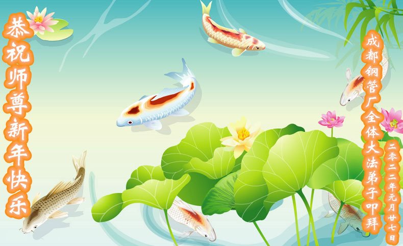 每逢年节恭祝师父过年好,就会想到“明慧网”忆师恩系列文章,没有师尊的巨大承受,全世界的人都活不到今天。知道真相的人都在敬念九字真言“法轮大法好、真善忍好”;诚心诚意的谢师恩。思前想后,我是全世界上最幸福的人!因为弟子有伟大的师父! 献真心 怕啥、金钥匙打开私心门 无私无我正念足慈悲增 遵师尊教诲做好三件事 放弃生死念慈悲救众生 弟子跪拜师尊双手合十 四川省成都钢管厂全体大法弟子恭祝师尊新年快乐!