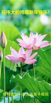 我们是跟随师尊修炼了二十多年的大法弟子,师恩慈悲保护弟子,让我们明白了生命的意义,更为我们消去无边的业力,从地狱捞起洗净,为我们铺就了返本归真的正法大道。弟子生命得以救度的喜悦和感恩无以言表。值此新年之际,恭祝慈悲伟大的师尊新年快乐!师父新年好!叩谢师尊! 辽宁省盘锦市辽河油田大法弟子恭祝师尊新年快乐!