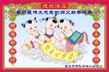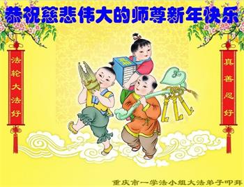 重庆市沙坪坝区一学法组大法弟子敬上 重庆市部队一学法组大法弟子恭祝最伟大慈悲的师父新年快乐!