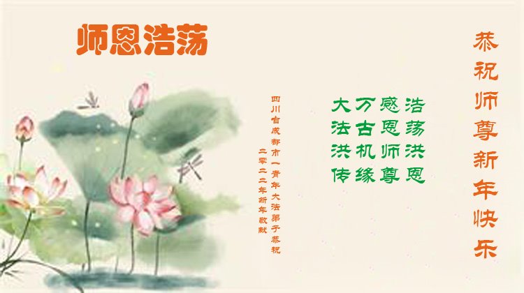 师尊啊!弟子们想念师尊! 感恩师尊对宇宙一切生命的无量慈悲!对大法徒的无比保护与珍惜!弟子们唯有好好修炼多多救人,兑现久远誓约少遗憾以报师恩之万万一! 弟子们跪谢浩荡师恩!再次恭祝师尊过年好!过年快乐! 四川成都一学法小组全体大法弟子九叩拜 2022年1月29日 四川成都青年大法弟子恭祝慈悲伟大的师尊新年快乐!