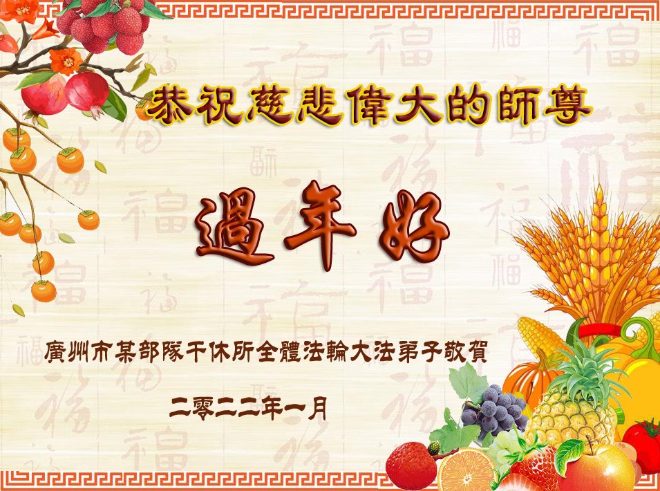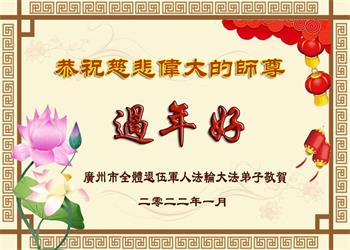 我们相信“法轮大法好!真善忍好!”在这大灾大难的年代里,在2022年来临之际,我们谢谢李大师的救命之恩,恭祝李大师新年快乐! 2022年1月27日 合十 广东省广州市全体退伍军人法轮大法弟子恭祝师尊过年好!