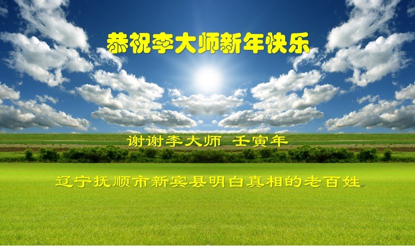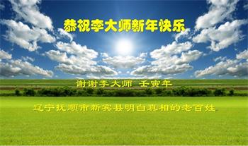 辽宁抚顺市新宾满族自治县明白真相的法轮功家属恭祝李大师过年好! 谢谢李大师把真善忍的美好传给我们! 壬寅年 大陆吉林省一百姓恭祝李大师过年好!