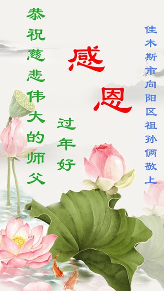 感恩师尊对弟子及家人的慈悲救度,师尊辛苦了。恭祝大法洪传三十周年,盼望更多的人能够得救。我们一定认真学法,背法,发正念,讲真相。 叩拜师尊! 黑龙江省佳木斯地区一大法弟子及全家恭祝师父新年好!
