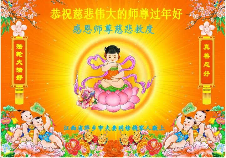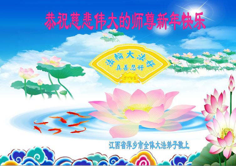 在新年来临之际,吉林市一学法小组大法弟子恭祝慈悲伟大的师尊过年好! 师尊您辛苦了!感恩师尊救度之恩! 江西省萍乡市全体大法弟子恭祝师尊新年快乐!师尊您辛苦了!弟子们叩谢师尊慈悲救度之恩!