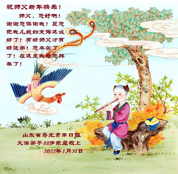 师父,您好啊!谢谢您保佑我! 我儿媳妇没学法轮功之前很小性子,总是惹我生气。修法轮大法后,变化很大,她不说话刺激我了,不惹我生气了,还经常关心我,是您把我儿媳妇变的这么好了!有好师父,才有好徒弟啊! 我这个88岁的老太婆给您拜年了!祝您新年快乐! 山东省寿光市羊口镇一大法弟子家属敬上 2022年1月31日 山东省潍坊市寿光市北部小镇大法弟子家属恭祝师父新年快乐!