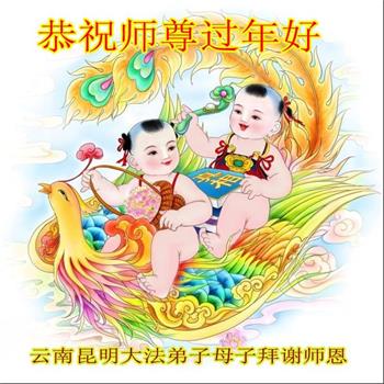 云南昆明大法弟子与儿子恭祝师尊过年好!
