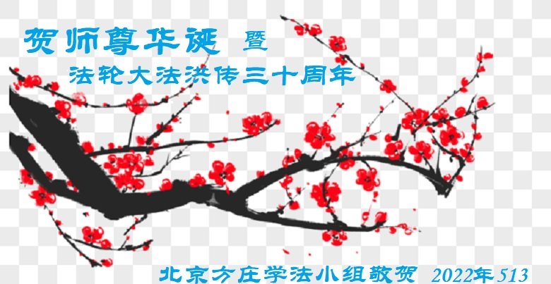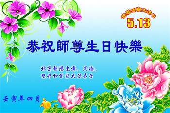 “五·一三”是全球大法弟子每年最盼望的日子——是我们师父的生日!“五·一三”是世界法轮大法日——是我们大法弟子神圣的节日!在“五·一三”即将来临之际,我们遥隔万里恭祝师尊生日快乐!我们是“七·二零”以前的老弟子,如今都步入了耄耋之年。每当回忆起得法之初大法洪传的盛况,师父为我们消业无病一身轻的神奇,明白人生目地的豁然,总会泪流连连,深感师恩浩荡,无以言述、无以言报。20多年的修炼历程,坎坷不平,但我们随时都能记住我们是师父的弟子,一切只听师父的安排,其它安排一概不承认,也不要。在师父的慈悲保护下,坚持走到今天。在全球欢庆世界法轮大法日之时,请师父放心,我们一定会做好三件事,兑现誓约,跟师父回家!北 京耄耋夫妻老大法弟子感恩叩贺! 北京市朝阳区学法小组大法弟子恭祝师尊华诞快乐暨法轮大法洪传三十年!