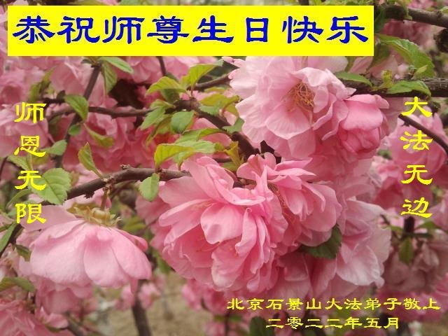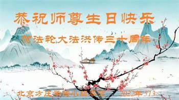 吾师传大法、正宇宙、授法徒。旧势力干扰正法,红魔迫害大法法徒。是师父灭败物、除旧势,承担了弟子们的业债。指引法徒反迫害、证实法、讲真相、救众生。三十载洪传大法,二十二年反迫害,回顾往事深感佛恩浩荡。末后之世灾频发,邪*党-内忧外患败亡之象尽显。请师父放心,弟子们一定牢记师训。不管世事怎样变化,我们正念坚定。做好三件事救度众生不放松。不辜负师父的期望,兑现史前誓约。 再一次敬祝:伟大师尊生日快乐! 北京丰台区大法弟子祝贺世界法轮大法日!恭祝师尊生日快乐!