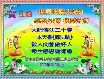 法轮大法好,让我做一个品质高尚的人,谢谢李大师之恩! 云南省昆明市明真相张氏家族祝贺5.13世界法轮大法日!感恩李大师!