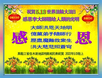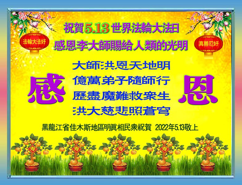 三:退.世人明白大法好,抹去兽印。谢谢李大师救度之恩。做有未来的人。 黑龙江省佳木斯地区明真相民众祝贺5.13世界法轮大法日!感恩李大师赐给人类的光明!